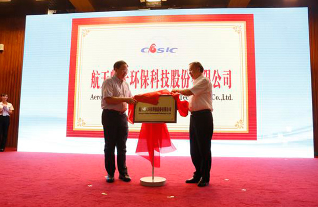 湖南省副省長張劍飛,中國航天科工集團公司黨組書記、董事長高紅衛(wèi)共同為“航天凱天環(huán)??萍脊煞萦邢薰尽苯遗?。